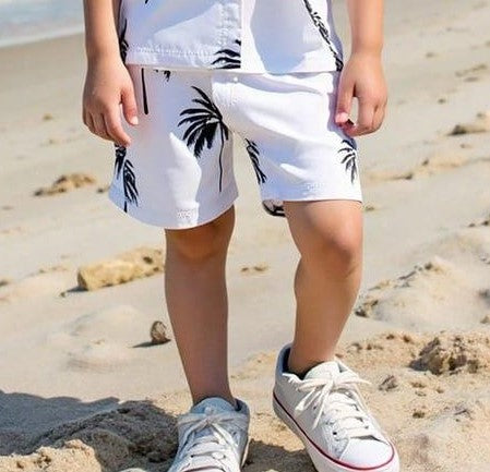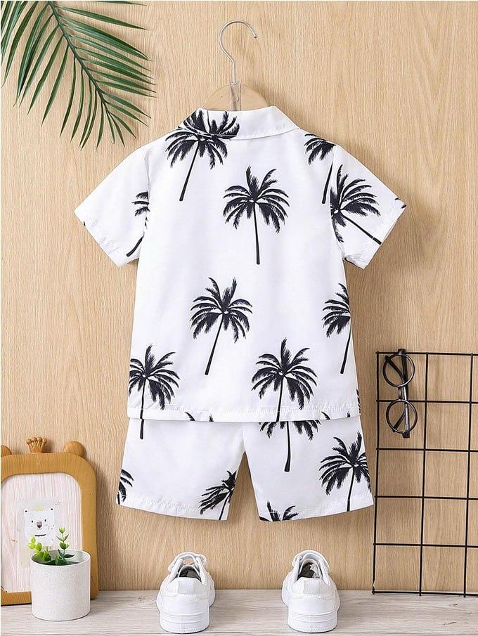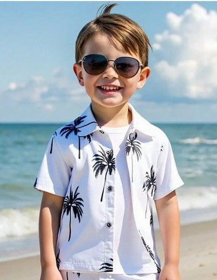 Keep your little one looking cool and stylish with this Baby Boy Palm Tree Print Summer Outfit. The set features a crisp white short-sleeve button-up shirt and matching shorts with bold black palm tree prints. Designed with soft, breathable fabric and an elastic waistband, it ensures comfort for all-day wear. Perfect for beach trips, vacations, summer parties, or casual outings.