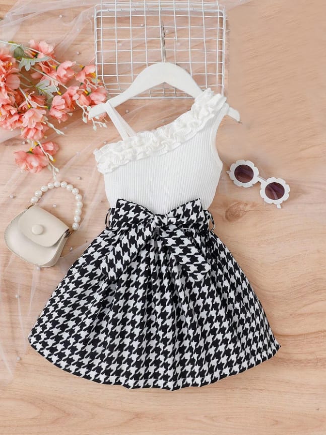 Give your little fashionista a stylish makeover with this trendy black-and-white houndstooth skirt set! Featuring a ribbed, one-shoulder white top with delicate ruffle detailing, paired with a pleated houndstooth skirt, this outfit is a perfect blend of elegance and sass. Ideal for parties, outings, and special occasions, your little one will steal the spotlight in this statement look!