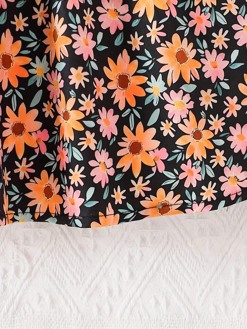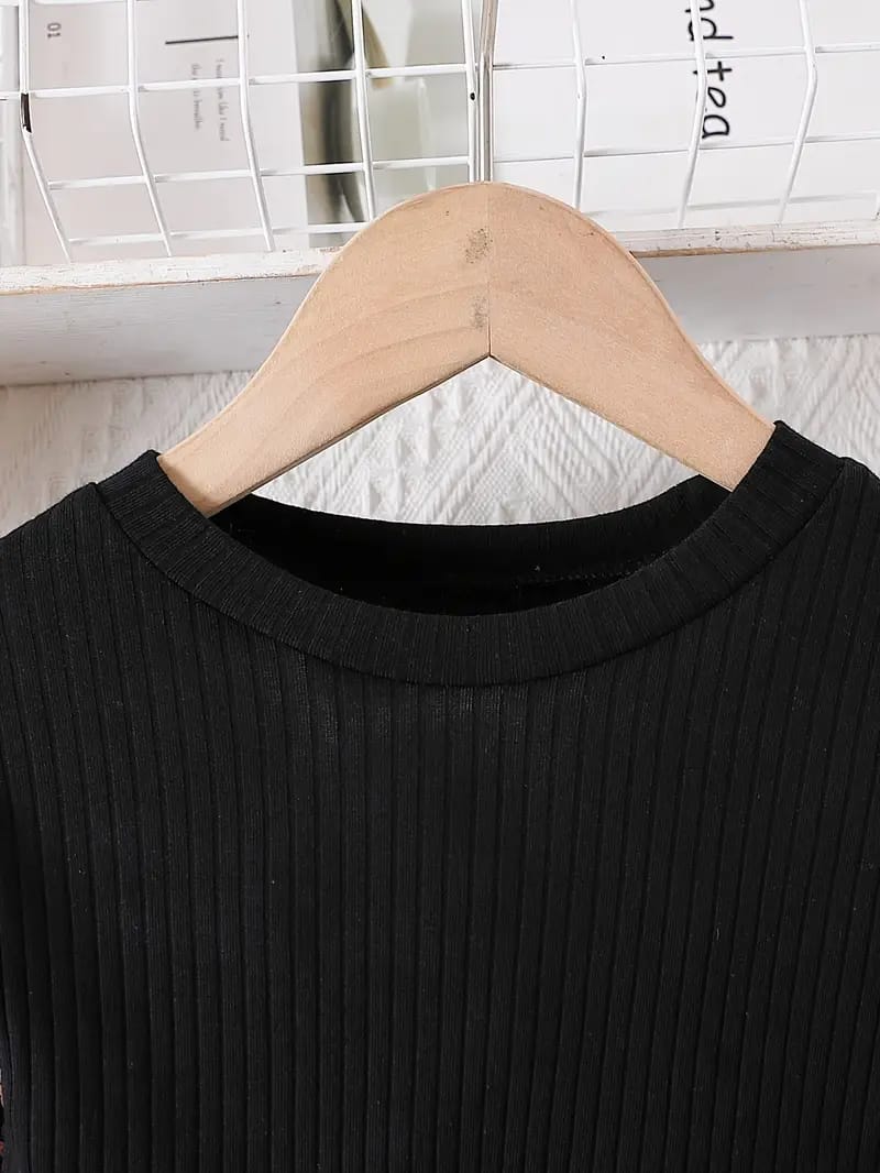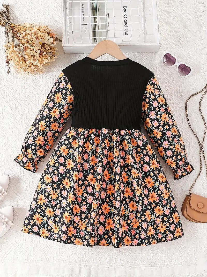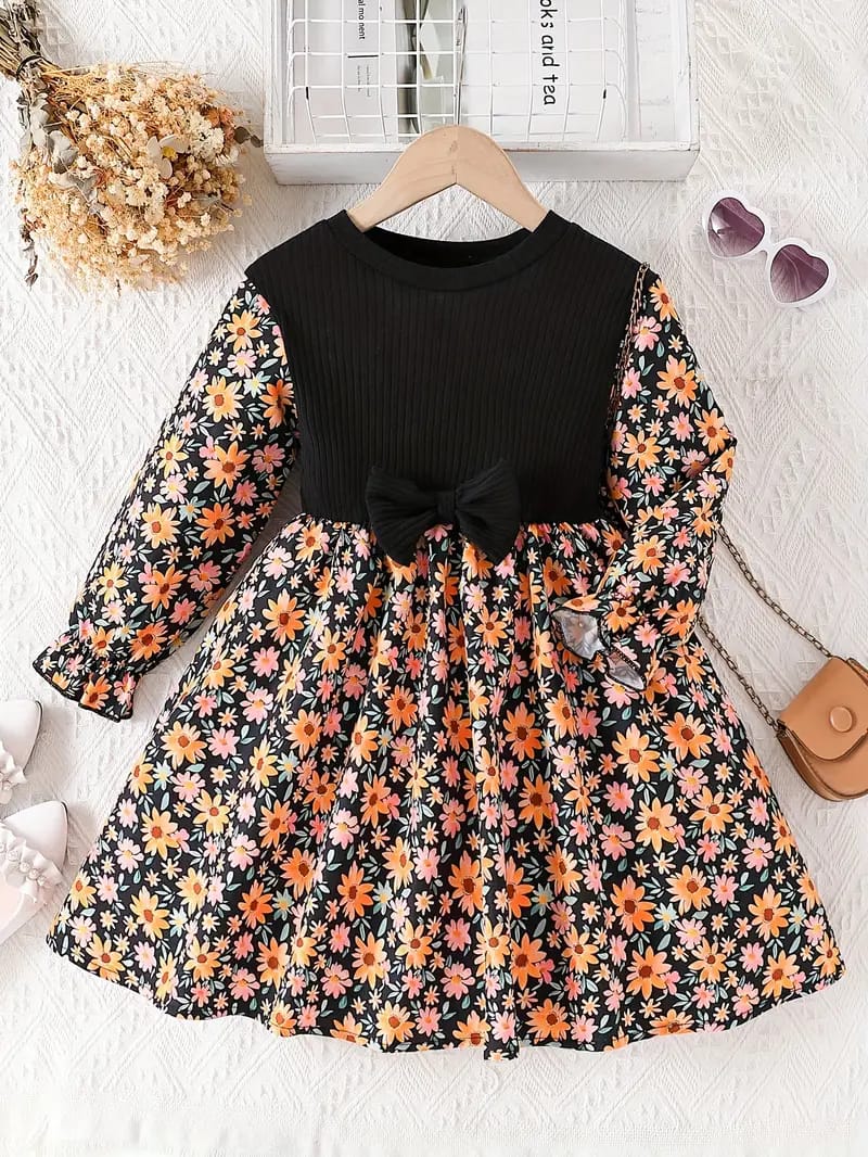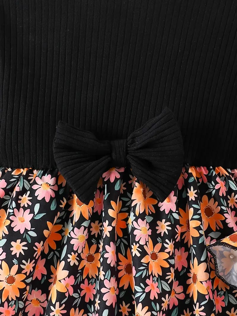 Let your little princess bloom in style with this charming floral dress! Featuring a sophisticated black ribbed bodice with a bow accent and a vibrant daisy-print skirt, this dress is a perfect blend of elegance and cuteness. The long sleeves with matching floral patterns add a trendy yet comfortable touch, making it ideal for any occasion.