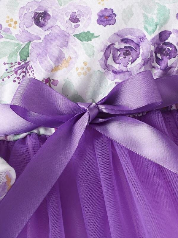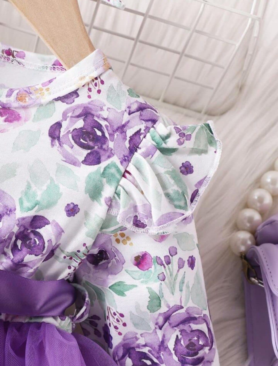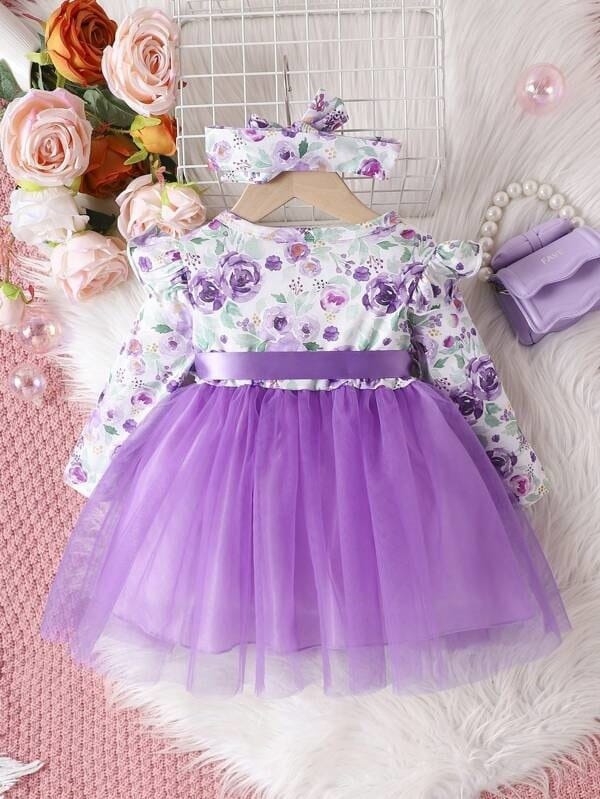 Let your little princess shine in this dreamy purple floral tulle dress! Featuring a delicate long-sleeve floral print top, charming ruffle shoulders, and a voluminous tulle skirt, this dress is perfect for birthdays, parties, and special occasions. The satin bow at the waist adds a touch of elegance, while the matching headband completes the look for an adorable outfit.