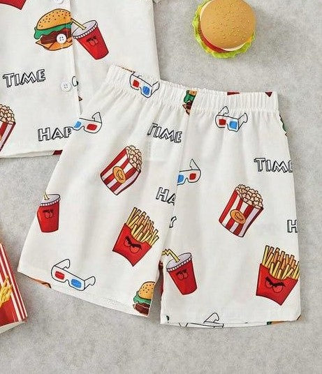 Bring joy and flavor to your child’s wardrobe with our Happy Meal Cartoon Print Kids Set! Featuring adorable illustrations of burgers, fries, popcorn, drinks, and 3D glasses — this outfit is as fun and playful as your little one’s personality.
