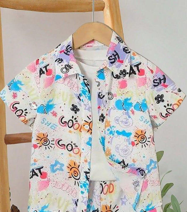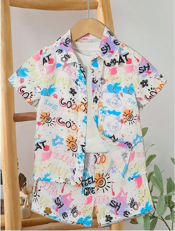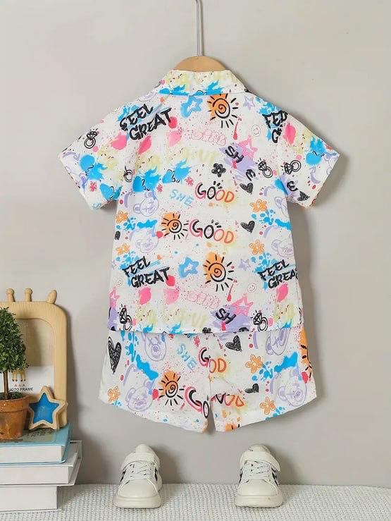 Add a splash of color to your little one’s style with this Vibrant Graffiti Print Summer Outfit. Featuring a short-sleeve button-up shirt and matching shorts, this set is all about fun, comfort, and creativity. The lively mix of doodles, stars, and cheerful prints makes it perfect for kids who love to stand out. Designed with breathable fabric and an easy elastic waistband, it’s as comfortable as it is trendy – ideal for summer outings, playdates, or festive occasions.