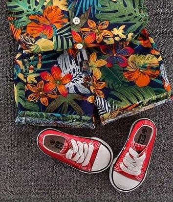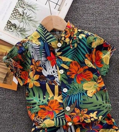 Let your little one bloom in bold island style with our Tropical Jungle Floral Kids Set! This eye-catching 2-piece outfit features a vibrant all-over floral and leaf print in rich greens, fiery oranges, sunny yellows, and deep reds – perfect for summer vacations, beach days, or just brightening up any day.